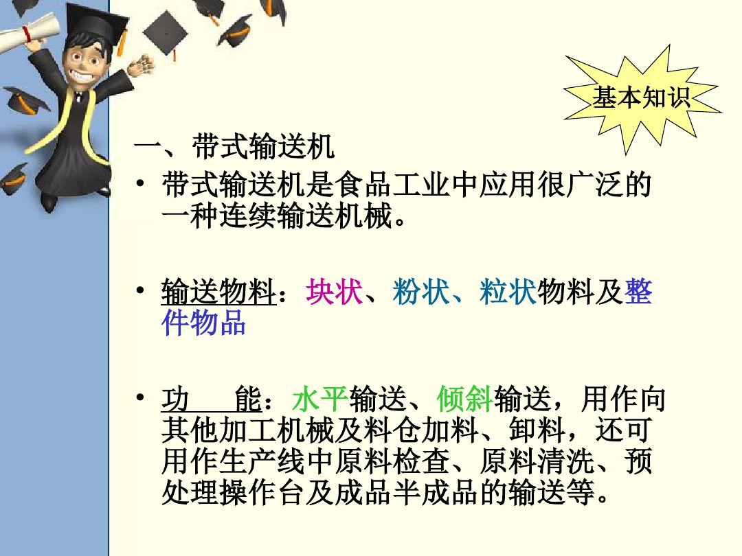 帶式輸送機 帶式輸送機是食品工業(yè)中應(yīng)用很廣泛的 一種連續(xù)輸送機械。