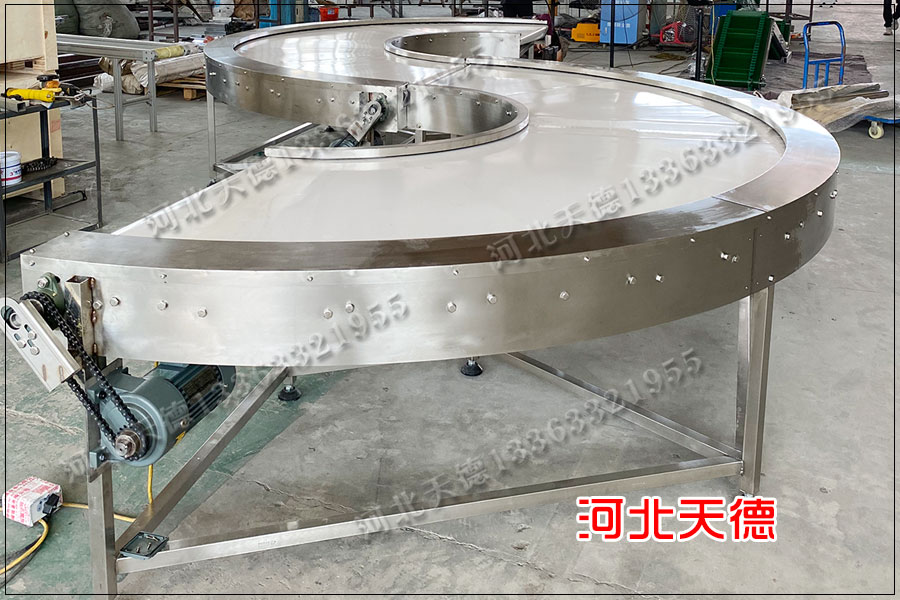 外圓弧板面,也就是滾筒的大端選用標準球面軸承,這種90度導輪式轉彎鏈條輸送機選擇是菱形座外球面軸承-205。其次整臺鏈條轉彎輸送機下方支撐架,機架選擇碳鋼、不銹鋼制作。整臺轉彎輸送設備高度與寬度需按客戶要求設計,驅動電機按照用戶需要設置在機架下面或機架上面。有速度調節要求要選擇變頻調速或選擇變速的減速電機。 皮帶轉彎機