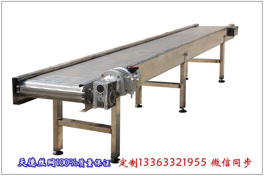 糖果包裝線金屬輸送帶我們采用什么形式什么規(guī)格的比較合適呢,這是昨天晚上10點(diǎn)客戶(hù)咨詢(xún)輸送糖果采用什么形式的金屬輸送帶比較好,我們?cè)敿?xì)的問(wèn)了客戶(hù)那邊的情況,客戶(hù)說(shuō)用來(lái)輸送散糖到下一道工序進(jìn)行裝袋子,然后裝箱子。單塊糖包裝好以后面積大概為4*6公分左右,要求載重一米上面在40公斤左右,根據(jù)這些要求應(yīng)該配合使用哪種輸送帶比較合適。聽(tīng)完這些后我們天德絲網(wǎng)給客戶(hù)介紹了一款板式輸送帶,這款板式輸送帶根據(jù)客戶(hù)不銹鋼輸送機(jī)的要求寬度定在了580毫米,輸送機(jī)長(zhǎng)度在15米,因此輸送鏈板的長(zhǎng)度就會(huì)是30米,板厚為1.2毫米,鏈節(jié)距為31.75毫米,穿桿直徑為6毫米,輸送鏈板表面打孔用來(lái)透氣,打孔直徑為3毫米。鏈板輸送機(jī)高度為500毫米,采用1.5千瓦點(diǎn)擊配帶變頻器。