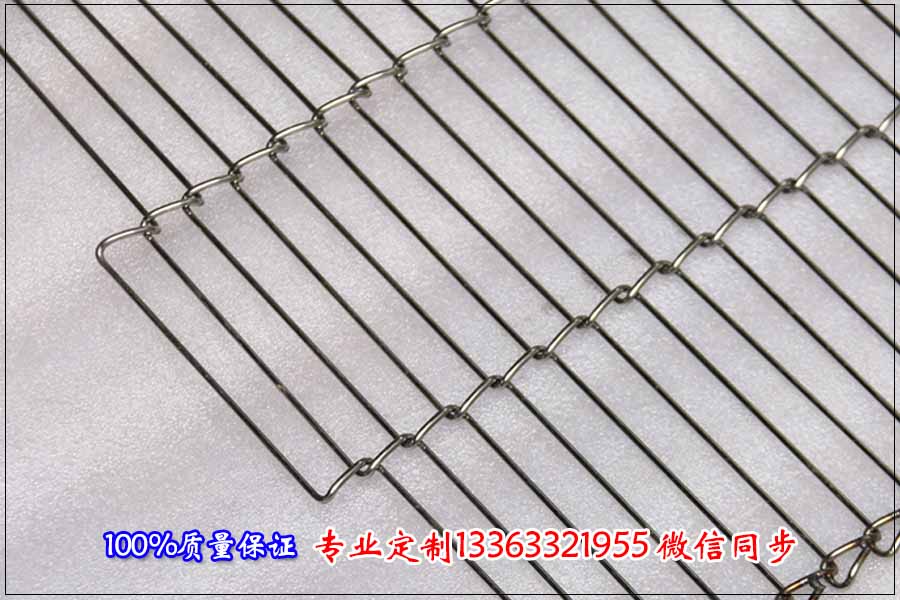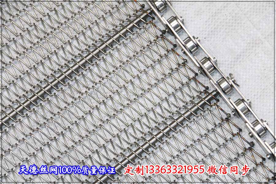 鏈條輸送網鏈的總寬度為800毫米,總長度為50米,網帶輸送機輸送距離為25米,根據每米載重臘肉20千克將絲徑定制為1.2毫米,孔徑采用1.2毫米的絲徑編織為10*20毫米,因為臘肉呈片狀,因此孔大小適中就可以。鏈條節距為31.75毫米,桿直徑為6毫米,桿直徑的距離為120毫米左右。整條帶子的載重部分是鏈條與穿桿。中間鋼絲編織的網帶只是起到一個支撐的作用。