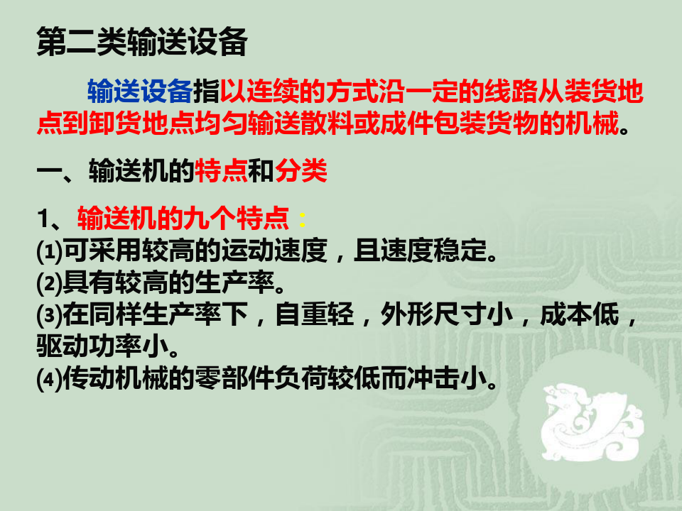 輸送設備 輸送設備指以連續的方式沿一定的線路從裝貨地點到卸貨地點均勻輸送散料或成件包裝貨物的機械。