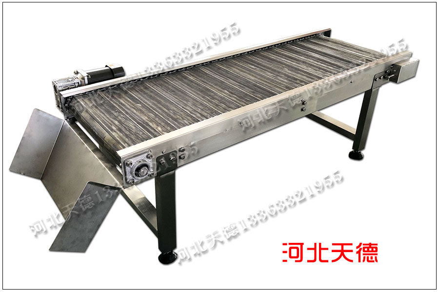 整臺輸送機采用不銹鋼304材質加工,輸送機機架厚度為3毫米,金屬輸送帶鋼絲編織鏈條輸送帶來傳送物料。